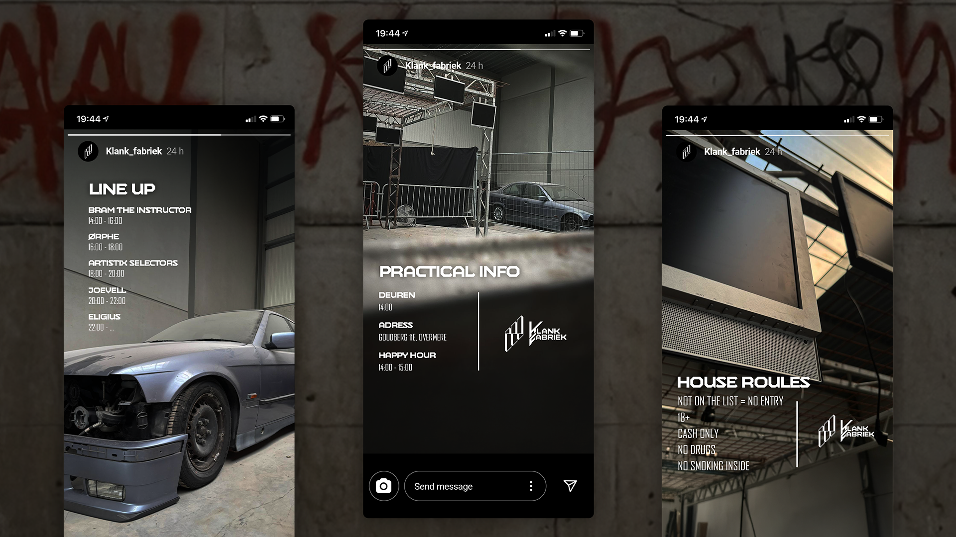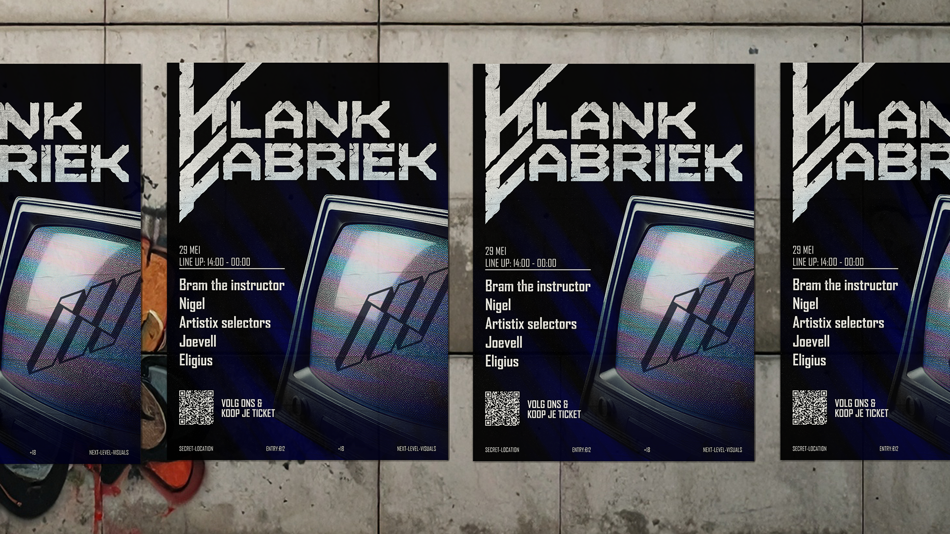 Klankfabriek vzw is a cultural event collective based in Zele that I co-founded. As a graphic designer, I was responsible for the complete visual identity, including branding, communication, and overall visual experience, with a strong focus on electronic music, art, and unconventional locations.